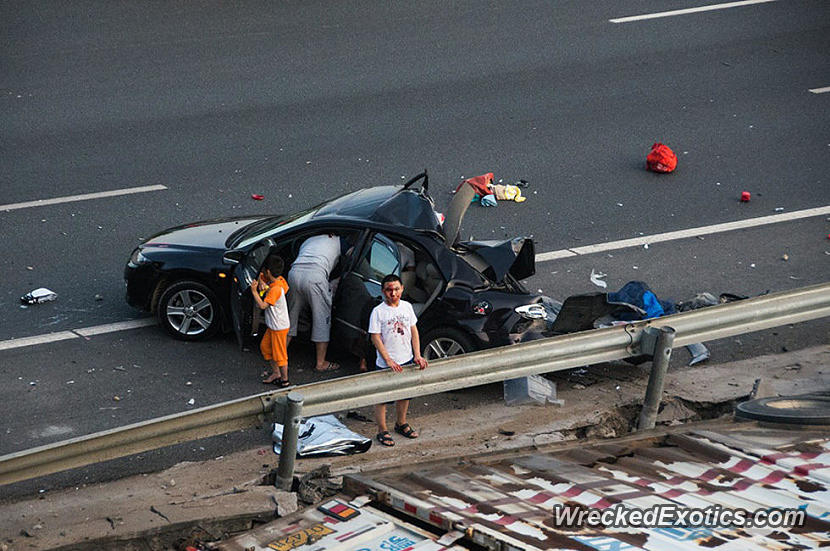 The total cost of all the vehicles involved in the accident came up to a staggering USD 1.6 million. Luckily, no one was seriously injured in the accident. One of the Mazda occupant who is visible in a photograph appears to have a few bruises on the face but looked fine, standing on his feet, overlooking the truck.
